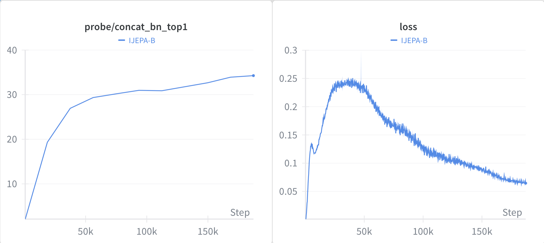 Figure: Training loss and linear probe accuracy for IJEPA-B trained for 300 epochs on 8xA100.